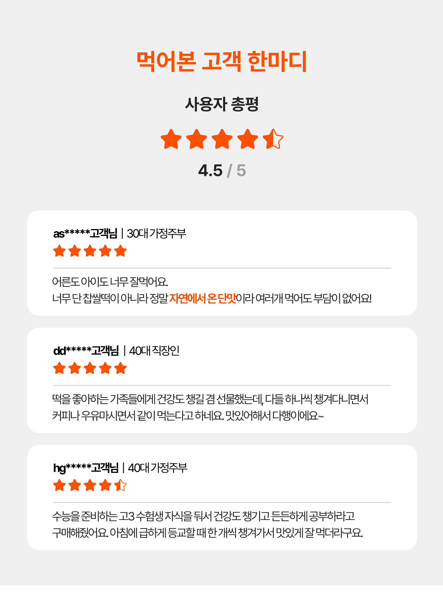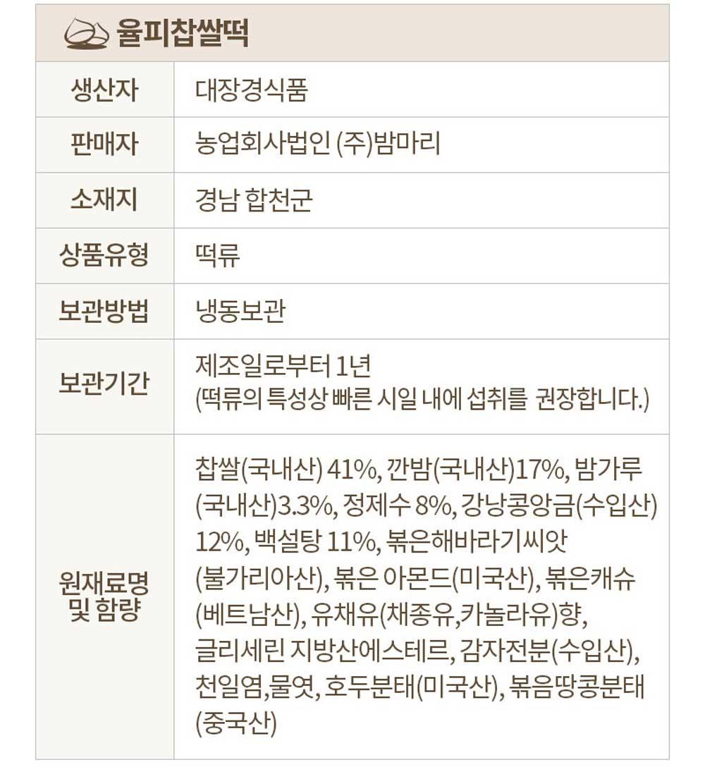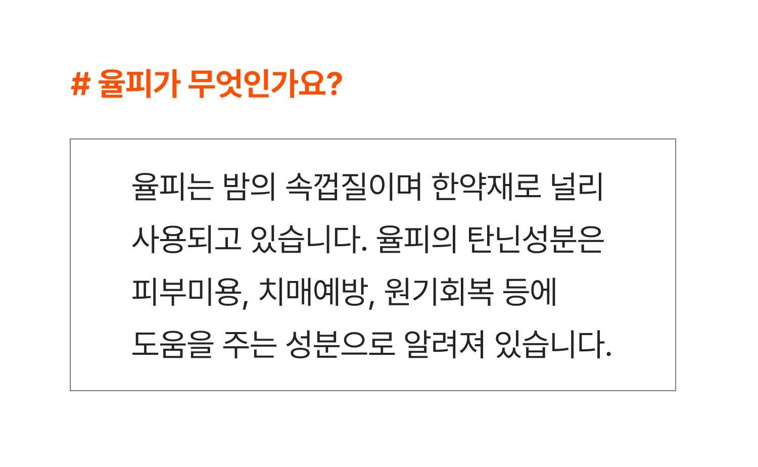 한약재로도 사용되는 밤의 속껍질 ‘율피’를 사용해 만든 찹쌀떡입니다. 첨가물 없이 설탕은 최소화해 만들었기 때문에 남녀노소 누구나 즐길 수 있는 간식입니다. 밤 페이스트나 밤 시럽 등 인위적인 재료 대신 깐 밤으로 밤 본연의 맛을 살리고, 순수한 깐 밤만을 직접 찌고 으깬 후 호두, 캐슈넛, 아몬드, 해바라기씨, 땅콩 5가지의 고소한 견과류를 넣어 자연의 맛을 최대한 살렸습니다. 개별 포장으로 출근하며, 간식으로, 커피나 차와 함께, 언제 어디서나 맛있는 율피떡을 즐겨보세요.