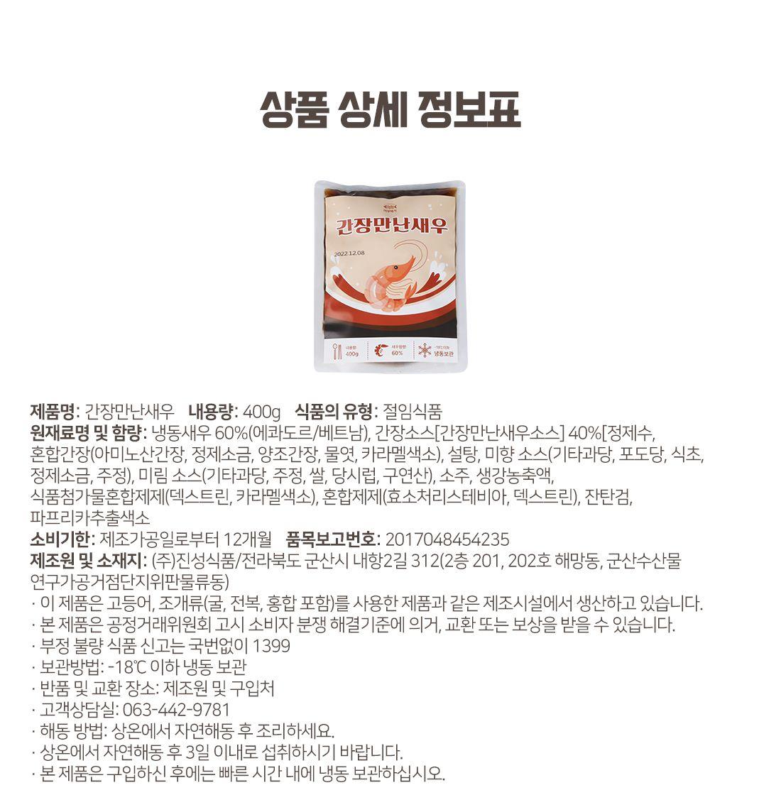 수산 가공 전문가의 노하우로 숙성하여 탱글함과 신선함을 그대로 담았어요. 새우의 머리는 풍미가 가득하여 숙성 시 머리가 함꼐하면 더욱 맛있는 새우장이 된답니다. 새우의 머리는 그대로, 몸통은 껍질을 제거한 상태이므로 더욱 맛있고 간편하게 먹을 수 있어요. 편리하게 일식집에서 맛보던 통통한 새우의 그 맛을 그대로 집에서 느껴보세요.