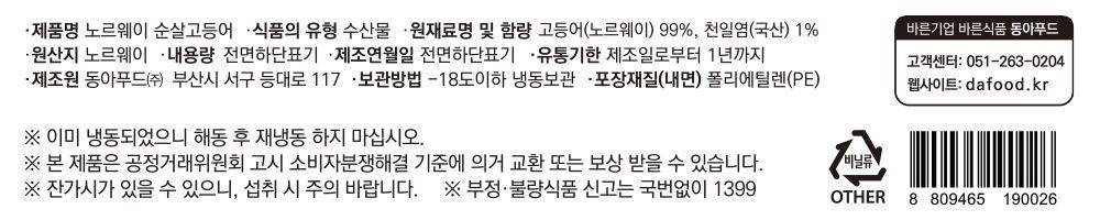 청정해역 대서양 현지에 직접 가서 보고 선적한 최상급 고등어로 제품을 생산하고 있습니다. 가시 때문에 생선구이가 꺼려지는 분이라면 순살 고등어가 제격! 뼈와 내장 모두 손질되어 손질 필요 없이 바로 구워 먹을 수 있어요. 한 토막씩 진공 포장되어 있어 필요할 때마다 잘라먹을 수 있답니다.
