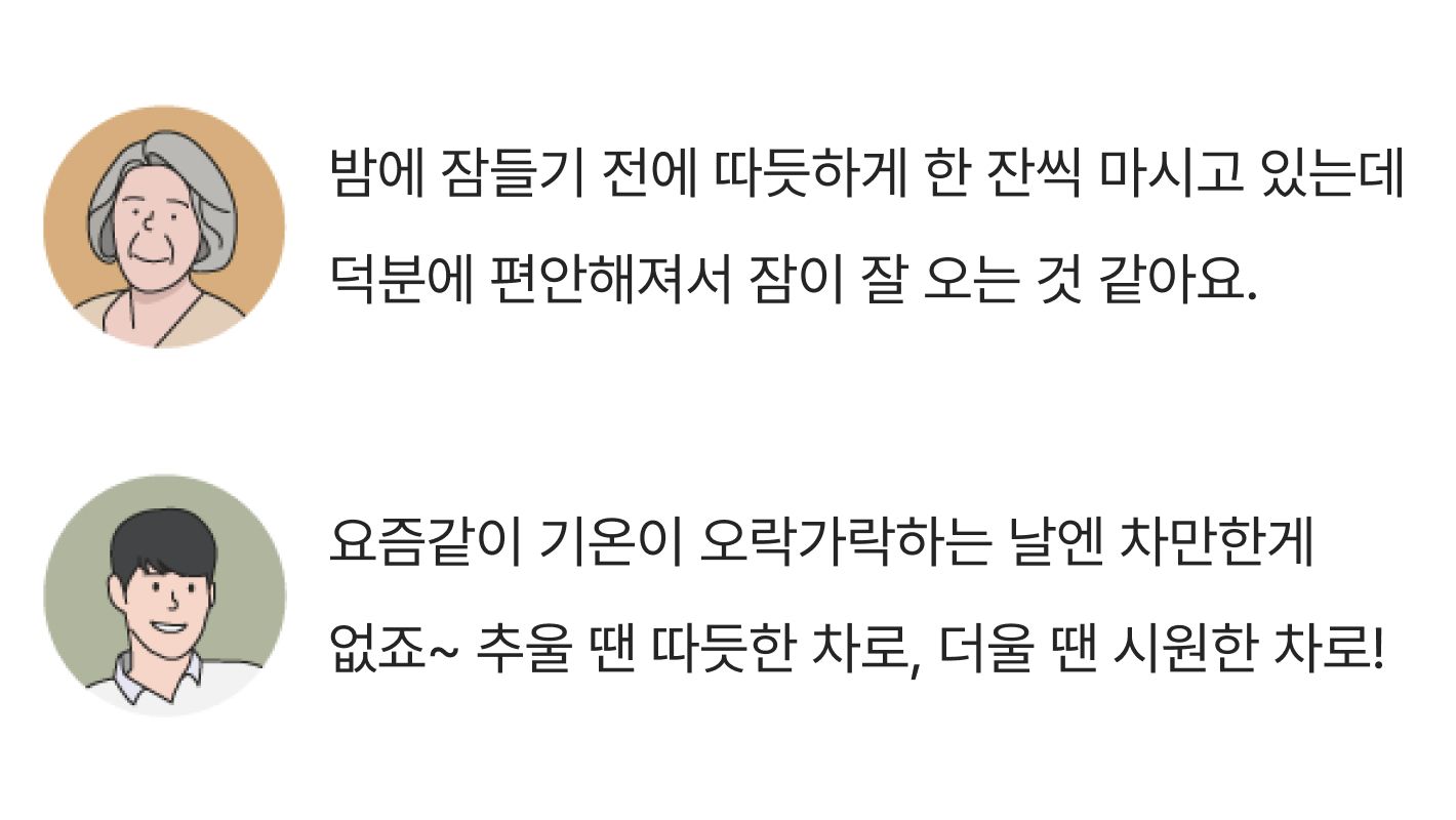 달큰한 맛과 은은한 향을 좋아하시면 캐모마일을, 시원하고 깔끔한 차를 원하신다면 페퍼민트를, 카페인 없이 깔끔한 맛을 원하신다면 루이보스를 추천드릴게요.