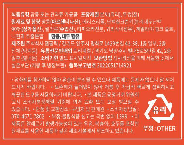 설탕 함유 0%의 빈크런치는 인공 당류가 아닌 땅콩 고유의 천연 당류만 함유되어 있어요. 설탕, 팜유, 유화제, 탈지분유 등 인공 화학 첨가물은 넣지 않은 땅콩버터입니다. 빈크런치의 이름대로 콩으로 만든 크런치로 한 병에 프로틴 64g이라는 풍부한 식물성 단백질이 담겨있어요. 게다가 바삭한 식감으로 씹는 즐거움까지 있습니다.