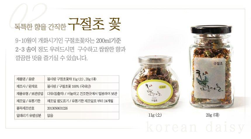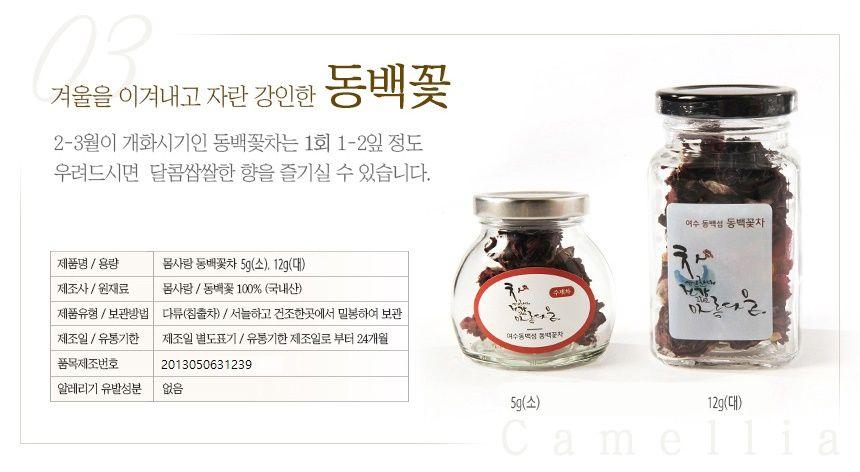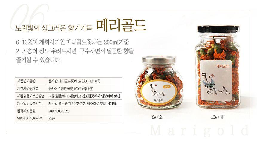 전남 여수 무농약 친환경 단지에서 해풍을 맞고 자란 꽃으로 만든 꽃 차입니다. 꽃을 하나하나 선별하고 여러 번의 덖음 과정을 거쳐 꽃의 독성을 없애고 제다하고 법제하는 과정 속에서 향과 맛을 살린 꽃 차가 완성됩니다. 진하게 우려나는 꽃의 색과 맛, 그리고 향을 느껴보세요.