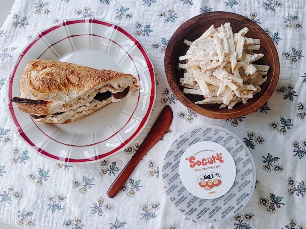 나를 위한 시간이 여유로워지는 주말 아침에 스윗드오 두유그릭요거트로 사과+콜라비 샐러드 & 보늬밤 샌드위치를 만들었어요.