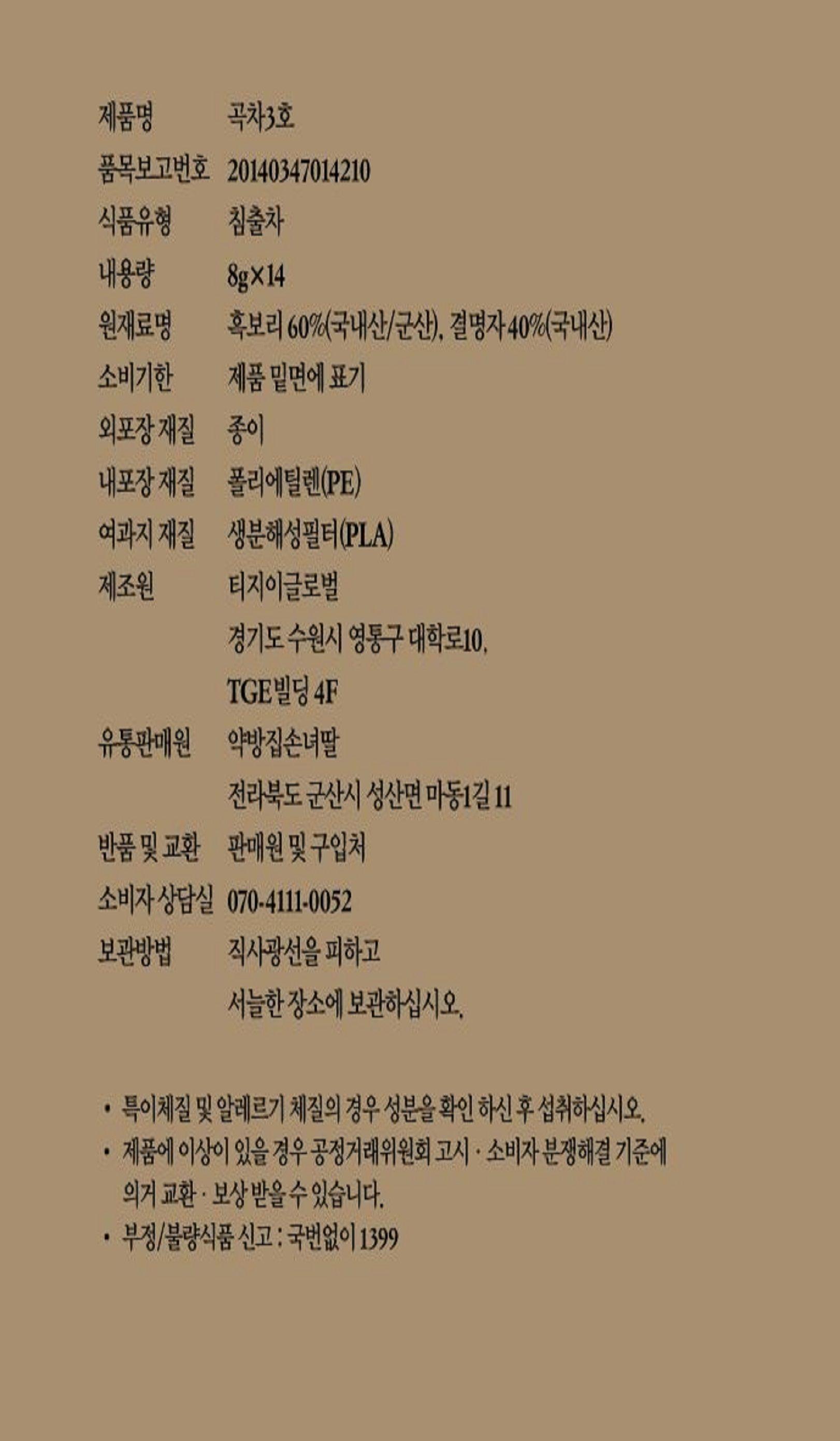 보리의 구수함과 결명자의 쌉싸름한 맛을 함께 느낄 수 있는 곡차 3호는 흑보리와 결명자를 6:4 비율로 블렌딩해 최적의 맛을 찾아냈어요. 삼각티백에 넣어 하루 종일 텀블러에 넣어 우리거나 냉침으로 우리면 식수로도 마실 수 있어요.