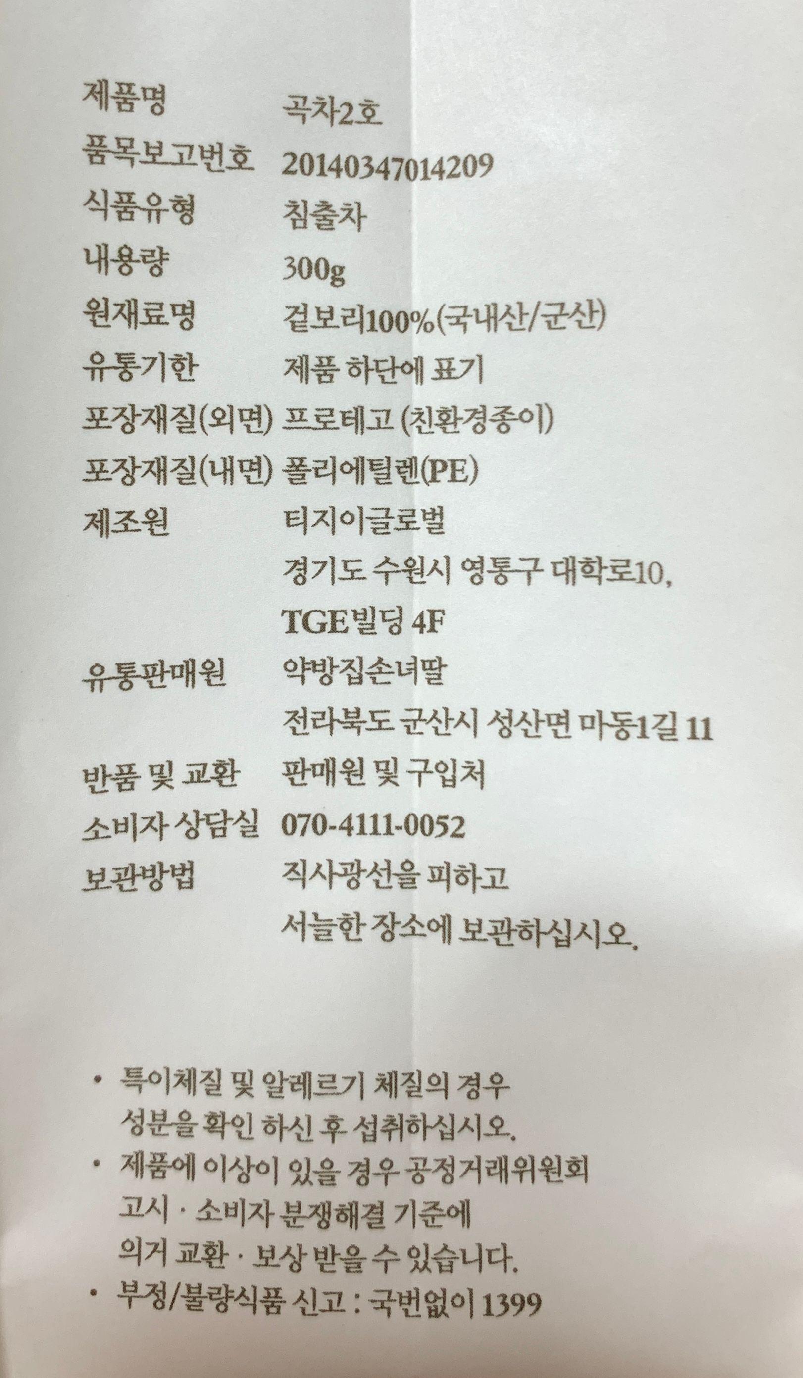목 넘김이 부드러운 산뜻하고 깨끗한 곡차 2호는 일반적으로 끓여먹는 보리차로 겉껍질에서 풍기는 보리 본연의 맛이 아주 특별합니다.