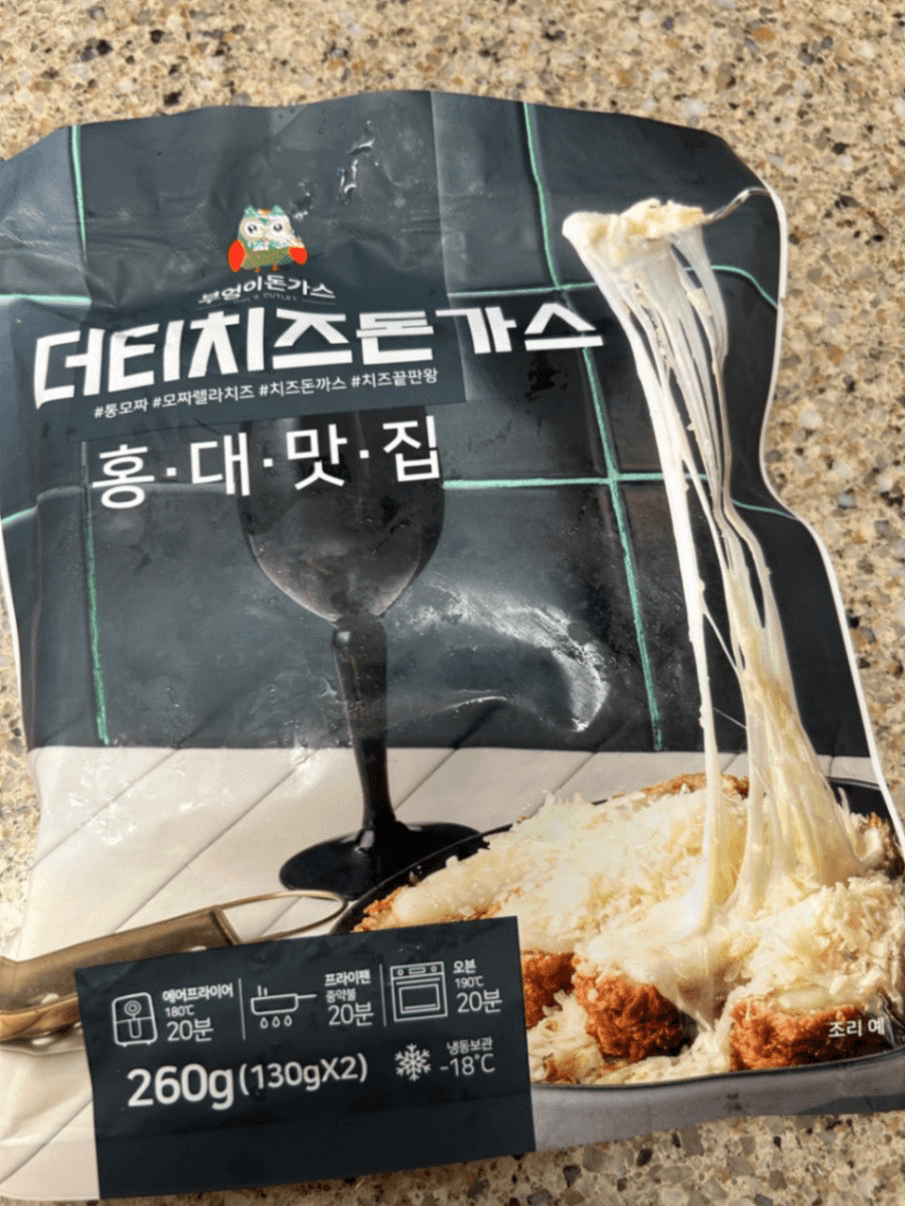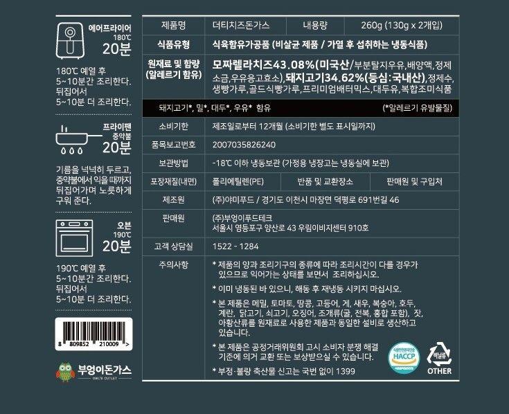 홍대 맛집으로 유명한 프리미엄 부엉이돈가스를 이제 집에서 간편하게 만나보세요. 고기부터 남다른 부엉이돈까스는 한 번도 얼리지 않은 100% 국내산 냉장 등심을 사용해 만듭니다. 습식 생 빵가루를 뿌려 튀겼기 때문에 바삭함의 차원이 다를 거예요. 순수 자연산 치즈만을 사용해 고소한 치즈의 맛과 향 그리고 커팅과 동시에 흘러내리는 푸짐한 치즈 양이 특징입니다.