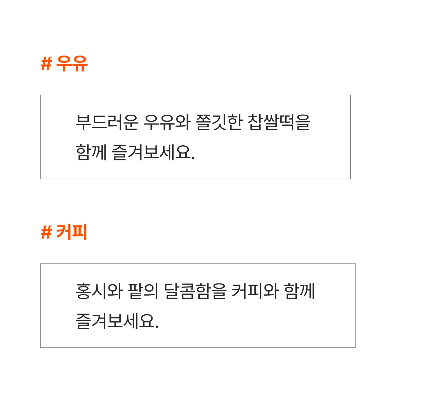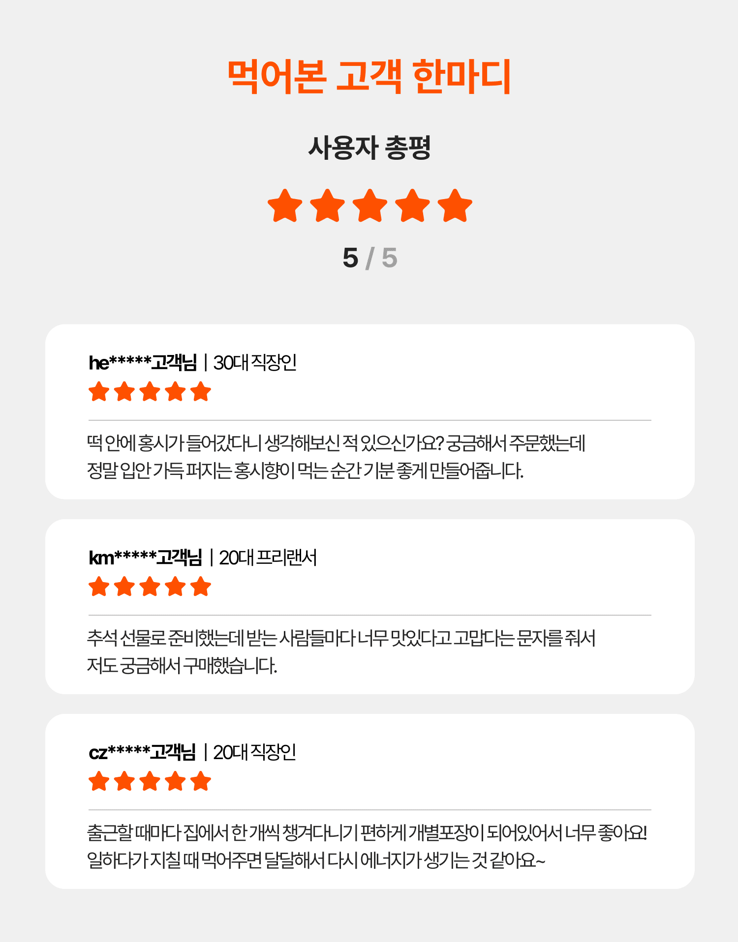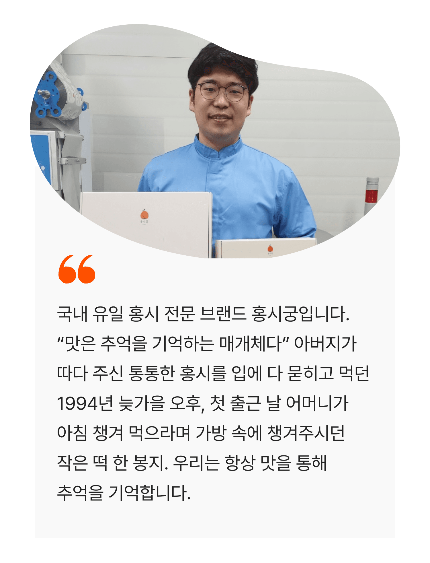 국내 유일의 홍시 전문 브랜드인 홍시궁의 노하우가 담긴 홍시 찹쌀떡을 소개할게요. 홍시 성형, 팥 감싸기, 떡 감싸기 등 전 과정 100% 수제로 탄생합니다. 고급 디저트라는 타이틀에 걸맞은 홍시궁의 고집이에요. 경북 청도의 최고급 아이스 홍시만을 사용하고 있으며, 국내산 찹쌀로 떡을 만들어요. 한 입 베어 물면 입안 가득 퍼지는 홍시향에 스며들어보세요.