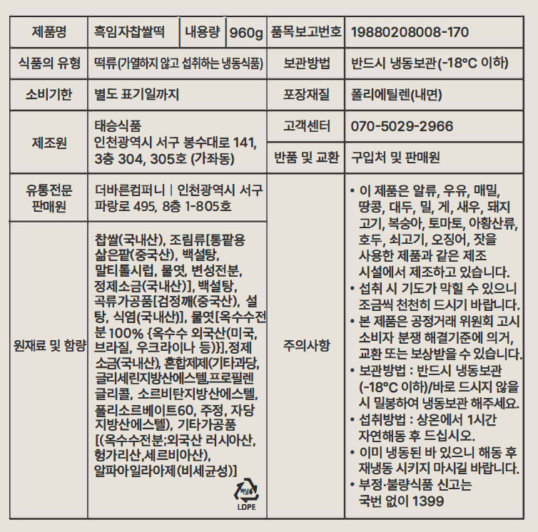 주문 즉시, 생산에 들어가는 더바른의 흑임자찹쌀떡은 100% 국산 찹쌀과 함께 만들어 쫀득하면서 쫄깃한 식감과 함께 고소한 흑임자의 맛을 즐길 수 있어요. 고소함과 담백함을 좋아하시는 할매입맛을 보유하신 분들이라면 정말 취향저격 당하는 흑임자찹쌀떡이랍니다. 냉동 보관했던 떡은 상온 30분 해동 후에 먹어도 떡의 쫄깃하고 쫀득한 식감과 맛을 느낄 수 있습니다. 떡의 포장 또한 국내 유일무이한 책 컨셉의 감성 패키지로 떡을 받는 즐거움이 있답니다.