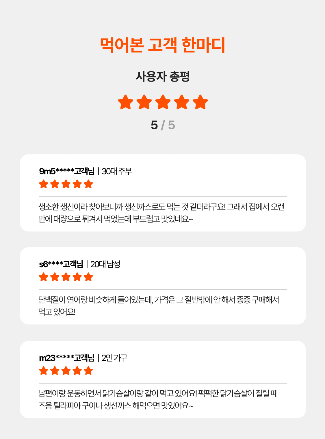 우리나라에서는 역돔이라 불리는 틸라피아에는 오메가3, 미네랄, 셀레늄 등의 풍부한 영양소가 함유되어 있어요. 100g당 20g의 단백질로 닭가슴살이 질리신 분들에게는 새로운 단백질 보충의 역할을 해줄 생선이에요. 구이용 등급보다 훨씬 높은 등급의 횟감 등급 틸라피아의 가시를 다 발라 순살로 되어있어요. 또 개별 진공 포장 되어 있어 한 팩씩 꺼내서 조리하기 편리해요. 구이나 생선까스로도 생선을 활용한 다양한 요리에도 활용할 수 있는 최고 가성비의 단백질 가득한 생선이랍니다.